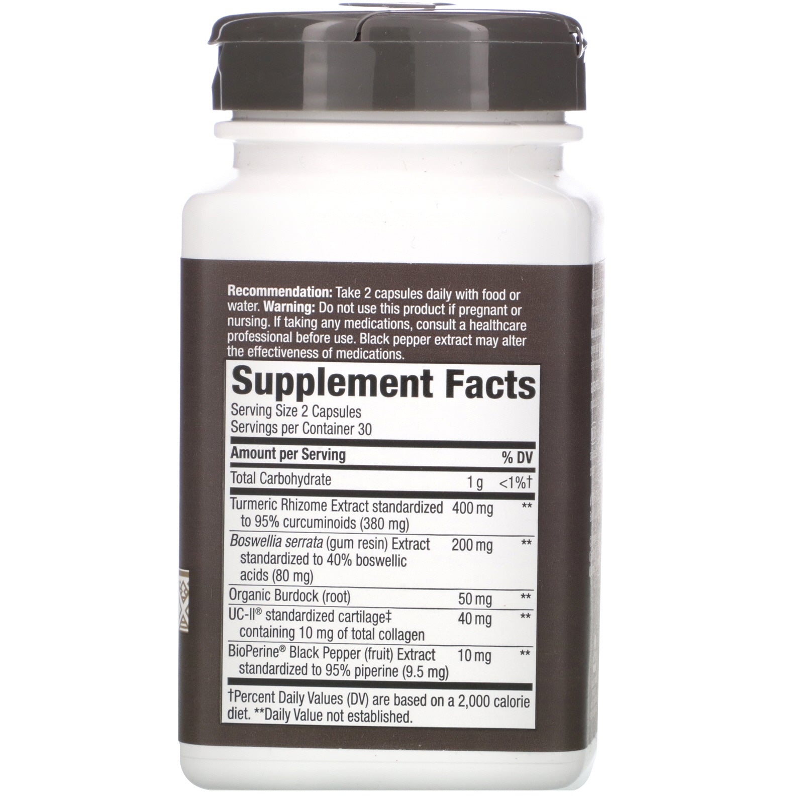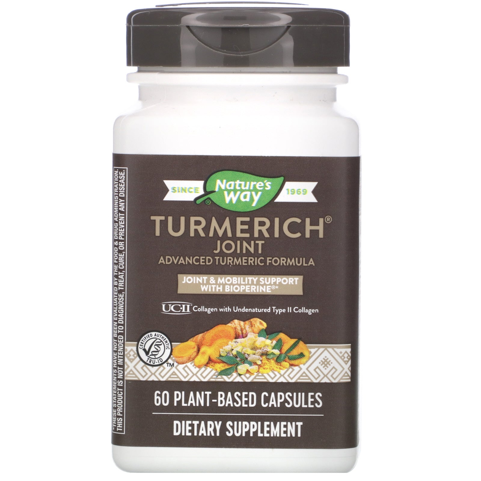 Since 1969 Advanced Turmeric Formula Joint & Mobility Support with Bioperine® UC-II® Collagen with Undenatured Type II Collagen Certified Authentic TRU-ID™ Dietary Supplement Joint & Mobility Support with Bioperine® to Boost Turmeric Absorption Turmerich®, by Nature's Way®, harnesses the power of 95% standardized turmeric root with a unique blend of UC II® collagen, boswellia, and organic burdock root to provide comprehensive joint and mobility support. Advanced Joint & Mobility Formula Turmerich® Joint is a triple-action formula that combines high-quality standardized turmeric with other top herbal and specialty ingredients to support joint health.Sugg. UseTake 2 capsules daily with food or water.Other IngredientsCellulose, plant-derived capsule (hypromellose), magnesium stearate, silica. Gluten free. No sugar, salt, yeast, wheat, soy, dairy products, or artificial colors, flavors, or preservatives.Supplement FactsServing Size: 2 Capsules Servings Per Container: 30 Amount Per Serving % Daily Value Total Carbohydrate 1 g <1%† Turmeric Rhizome Extract standardized to 95% curcuminoids (380...