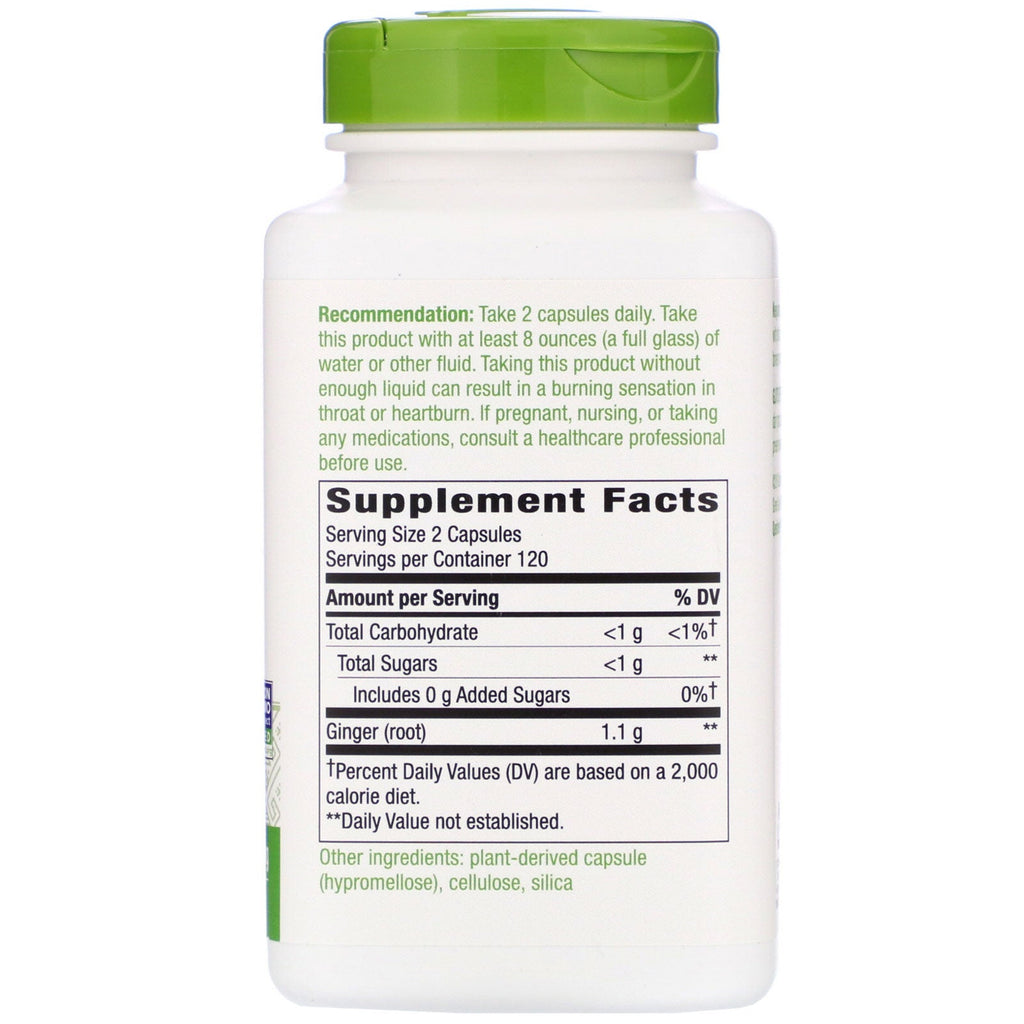 Since 1969 Traditional Digestive Supports Certified Authentic Tru-ID™ Non GMO Project Verified 1,100 mg Per Serving Dietary Supplement Vegan Traditional Digestive Supports Ginger has a deeply rooted history in Asian, Indian, and Arabic cultures as a traditional herbal remedy for digestive support. Nature's Way® brings you the best herbals available and sources ginger from where it grows best, like India and West Africa. At Nature's Way, we believe nature knows best. That's why our mission is to seek out the best herbs the earth has to give. It's the way we deliver uncompromising quality and help you live healthier.Sugg. UseTake 2 capsules daily. Take this product with at least 8 ounces (a full glass) of water or other fluid.Other IngredientsPlant-derived capsule (hypromellose), cellulose, silica. Gluten Free. No salt, yeast, wheat, corn, soy, dairy products, artificial colors, flavors or preservatives.Supplement FactsServing Size: 2 Capsules Servings Per Container: 120 Amount Per Serving...