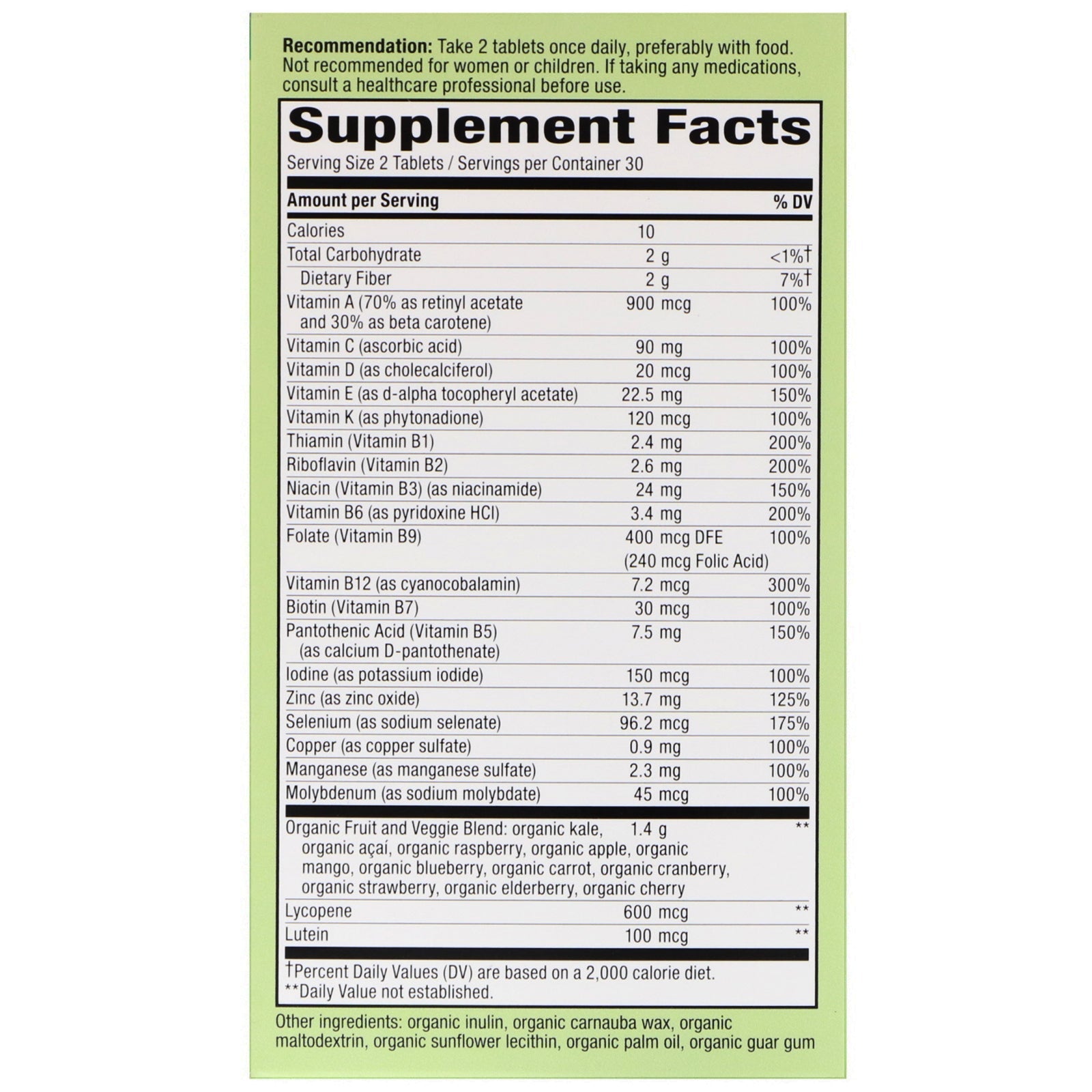 Serving Size: 2 Tablets Serving Per Container: 30 Amount Per Serving % Daily Value Calories 10 Total Carbohydrate 2 g < 1%† Dietary Fiber 2 g 7%† Vitamin A (70% as retinyl acetate and 30% as beta carotene) 900 mcg 100% Vitamin C (ascorbic acid) 90 mg 100% Vitamin D (as cholecalciferol) 20 mcg 100% Vitamin E (as d-alpha tocopheryl acetate) 22.5 mg 150% Vitamin K (as phytonadione) 120 mcg 100% Thiamin (Vitamin B1) 2.4 mg 200% Riboflavin (Vitamin B2) 2.6 mg 200% Niacin (Vitamin B3) (as niacinamide) 24 mg 150% Vitamin B6 (as pyridoxine HCl) 3.4 mg 200% Folate (Vitamin B9) 400 mcg DFE (240 mcg Folic Acid) 100% Vitamin B12 (as cyanocobalamin) 7.2 mcg 300% Biotin (Vitamin B7) 30 mcg 100% Pantothenic Acid (Vitamin B5) (as calcium D-pantothenate) 7.5 mg 150% Iodine (as potassium iodide) 150 mcg 100% Zinc (as zinc oxide) 13.7 mg 125% Selenium (as sodium selenate) 96.2 mcg 175% Copper (as copper sulfate) 0.9 mg 100% Manganese (as manganese sulfate) 2.3 mg 100% Molybdenum (as sodium molybdate) 45 mcg 100% Organic Fruit and Veggie Blend: Organic kale, organic acai, organic raspberry, organic apple, organic mango, organic blueberry, organic carrot, organic cranberry, organic strawberry, organic elderberry, organic cherry 1.4 g ** Lycopene 600 mcg ** Lutein 100 mcg ** †Percent Daily Values (DV) are based on a 2,000 calorie diet. **Daily Value not established.Disclaimer
