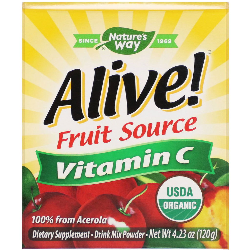Since 1969 100% From Acerola USDA Dietary Supplement Certified by Quality Assurance International Vegetarian Fruit Source Unlike other supplements that use isolated ascorbic acid or cultured bacteria as the source of Vitamin C, Alive!® Fruit Source Vitamin C derives its entire Vitamin C content from one of Mother nature's most potent fruit sources. 100% Fruit Complex Vitamin C in fruit is naturally part of a total complex that includes ascorbic acid, bioflavonoids and co-factors that aid absorption. Alive!® Fruit Source Vitamin C is complete Vitamin C just as Mother Nature grows it. Certified Vegetarian FormulaSugg. UseStir powder into an 8 ounce glass of water or juice, or add to smoothies. For 500 mg of Vitamin C take 1 rounded teaspoon daily. For 1000 mg take 1 rounded teaspoon twice daily.Other Ingredients manioc root. Gluten free. No corn, soy, dairy products, sugar, wheat, yeast, artificial colors, flavors or preservatives.Supplement FactsServing Size:...