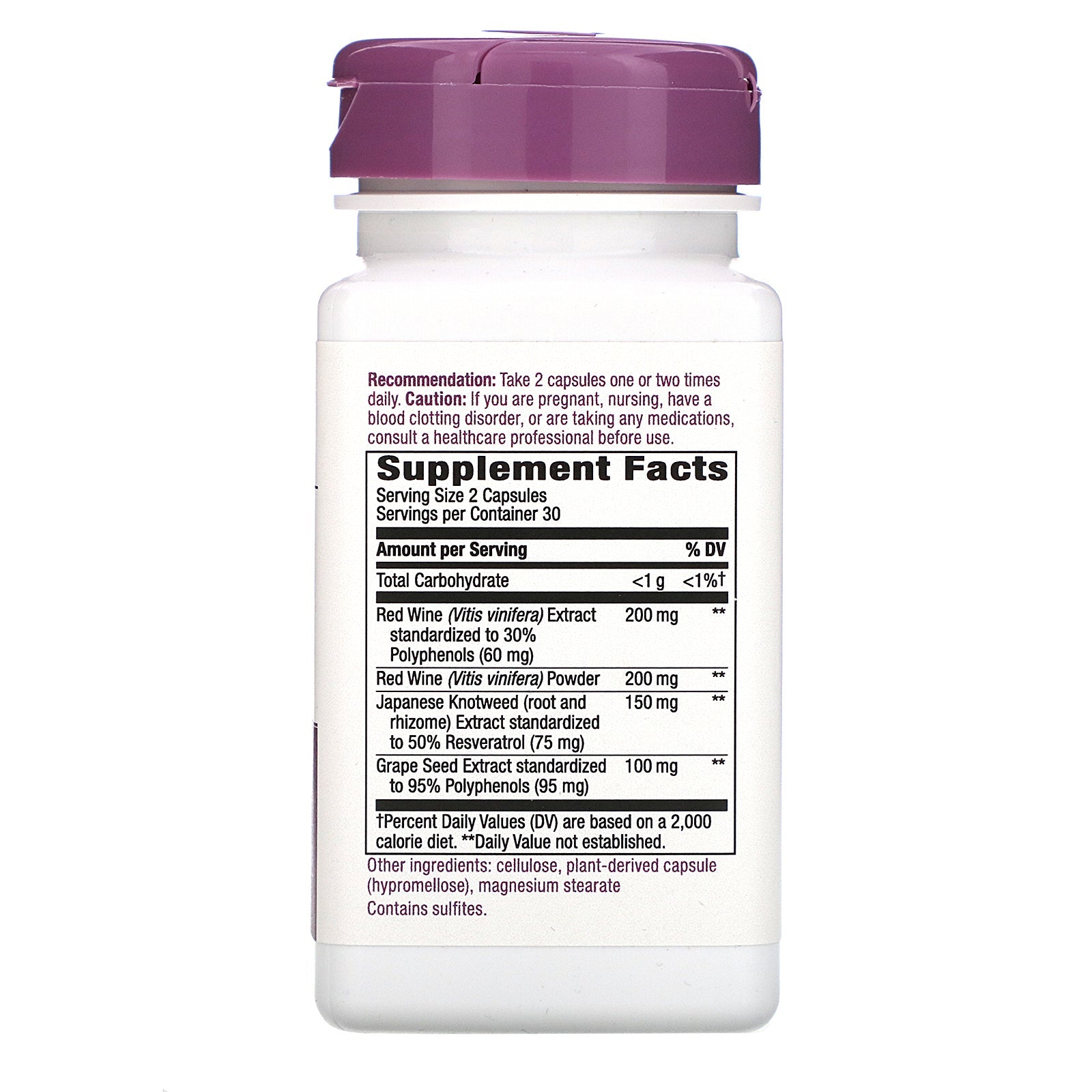 Since 1969 Premium Blend Synergistic Free Radical Protection 4-Part Blend Dietary Supplement Vegan Resveratrol, a chemical found in red wine, is often used in traditional wellness practices. Resveratrol is used to support antioxidant activities in the body. Nature's Way® routinely tests its resveratrol to maintain superior quality standards.Sugg. UseTake 2 capsules one to two times daily.Other IngredientsCellulose, plant-derived capsule (hypromellose), magnesium stearate. Contains sulfites. Gluten free. No sugar, salt, yeast, wheat, soy, dairy products, or artificial colors, flavors, or preservatives.Supplement FactsServing Size: 2 Capsules Servings Per Container 30 Amount Per Serving % Daily Value Total Carbohydrate <1 g <1%† Red Wine (Vitis vinifera) Extract standardized to 30% Polyphenols (60 mg) 200 mg ** Red Wine (Vitis vinifera) Powder 200 mg ** Japanese Knotweed (root and rhizome) Extract standardized to 50% Resveratrol (75 mg) 150 mg ** Grape Seed Extract standardized to 95% Polyphenols (95 mg) 100 mg ** †Percent Daily...