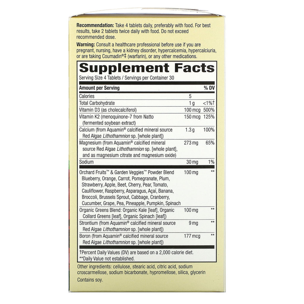 Serving Size: 4 Tablets Servings Per Container: 30 Amount Per Serving % Daily Value Calories 5 Total Carbohydrate 1 g < 1%† Vitamin D3 (as cholecalciferol) 100 mcg 500% Vitamin K2 (menoquinone-7 from Natto (fermented soybean extract) 150 mcg 125% Calcium (from Aquamin® calcified mineral source Red Algae Lithothamnion sp. [whole plant]) 1.3 g 100% Magnesium (from Aquamin® calcified mineral source Red Algae Lithothamnion sp. [whole plant], and as magnesium citrate and magnesium oxide) 273 mg 65% Sodium 30 mg 1% Orchard Fruits™ & Garden Veggies™ Power Blend Blueberry, Orange, Carrot, Pomegranate, Plum, Strawberry, Apple, Beet, Cherry, Pear, Tomato, Cauliflower, Raspberry, Asparagus, Acai, Banana, Broccoli, Brussels Sprout, Cabbage, Cranberry, Cucumber, Grape, Pea, Pineapple, Pumpkin, Spinach 100 mg ** Organic Greens Blend: Organic Kale [leaf], Organic Collard Greens [leaf], Organic Spinach [leaf]) 100 mg ** Strontium (from Aquamin® calcified mineral source Red Algae Lithothamnion sp. [whole plant]) 9 mg ** Boron (from Aquamin® calcified mineral source Red Algae Lithothamnion sp. [whole plant]) 177 mcg ** †Percent Daily Values (DV) are based on a 2,000 calorie diet. **Daily Value not established.Disclaimer